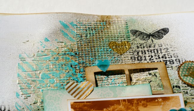 Jag har några favoritfoto som jag använder om och om igen.. detta är ett av dem. Jag har lekt med väggskarvtejp, dreamweaverstencil, modelling paste, guldspray från Crafter’s Companion och Gelatos. Maggie Holmes Styleboard med alla fina gulddetaljer är perfekt till detta.